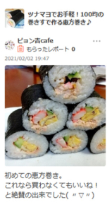 今回作っていただいたのは、ツナマヨでお手軽!100均の巻きすで作る恵方巻き♪ で