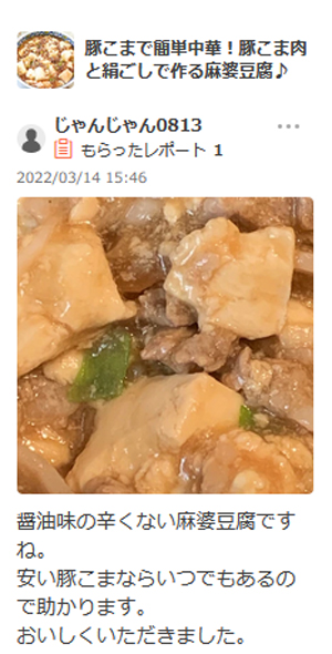次は、豚こまで簡単中華!豚こま肉と絹ごしで作る麻婆豆腐♪ を じゃんじゃん0813 さんが作ってくださいました。