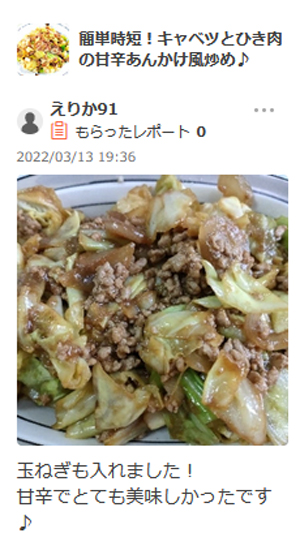 最後は、簡単時短!キャベツとひき肉の甘辛あんかけ風炒め♪ をえりか91さんが作ってくださいました。
