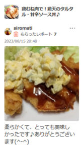 チキンタルタル南蛮の派生バージョンですが、喜んでいただけて嬉しいです。
