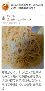 たらこのパスタ、個人的に大好きなので、作っていただけて嬉しいです。
