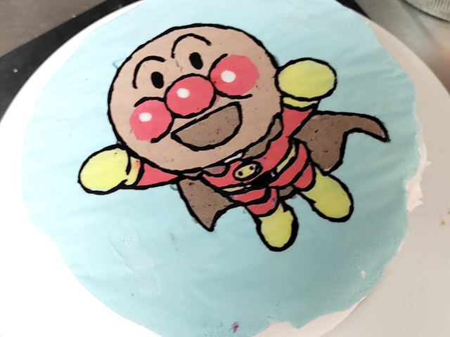 ![]() 1:セルクル台などの平らなボードに、コピー用紙などでカラー印刷したキャラクターとケーキの直径よりやや小さい円を描いた画像を逆方向に印刷しておきます。 (今回は文字がないですが、文字を入れる場合、逆向きにしておかないと、ひっくり返した時に文字が読めなくなります。) 2:台の上に、コピー用紙をしっかりとガムテープで留め、その上に、クッキングシート(裏と表の文字がある高級タイプ)を乗せ、こちらも動かないように、平らに伸ばしながら、ガムテープでしっかりと接着します。 |