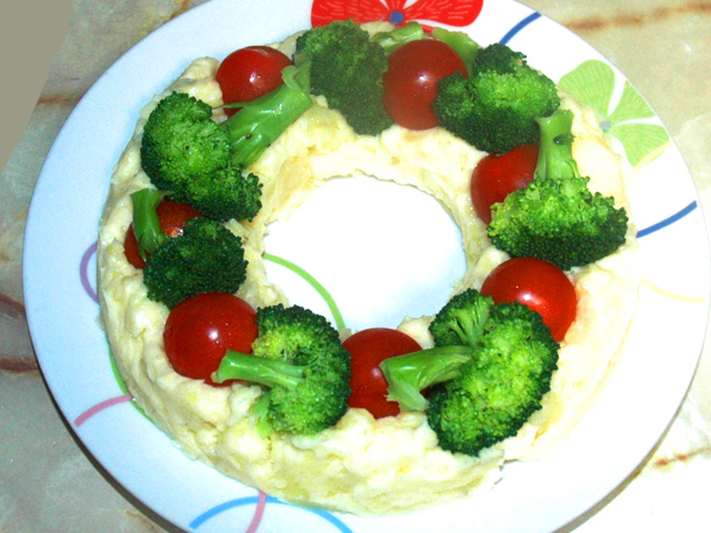 ケーキ用のリング型があったので、それでクリスマスリース風のポテトサラダを作ってみました。