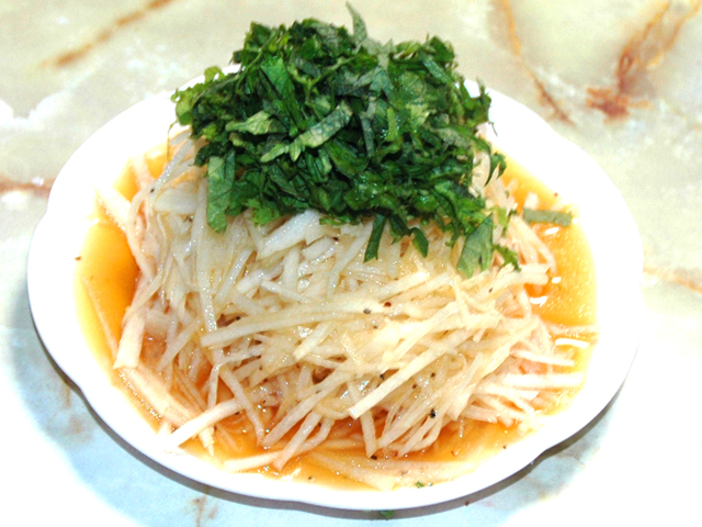 <所要時間:約5分> 材料:4人分 ●大根…300gほど ●青じそ…8~10枚 ●寿司酢…大3 ●醤油…大1 ●にんにくチューブ…3cm ●サラダ油…大1 ●黒コショウ…小1/4 作り方 大根は皮をむき、千切りにする。 切った大根を水を張ったボールに入れて、数分置く。 (この一手間... -